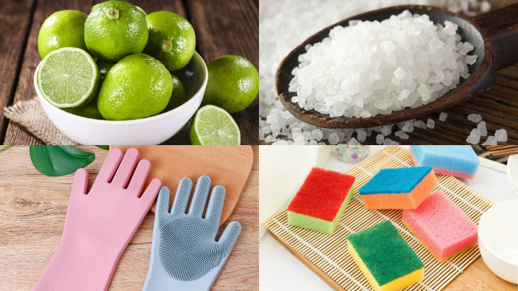 Chuẩn bị các vật dụng đơn giản như khăn mềm, bàn chải, giấm trắng, baking soda, chanh, muối biển, và nước ấm.