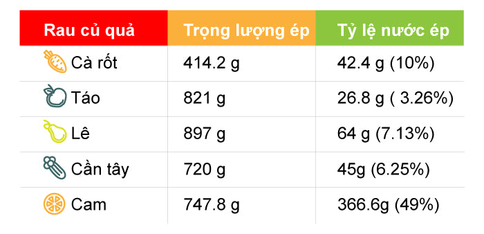 | Tỷ lệ ép một số loại rau củ quả thông dụng: |