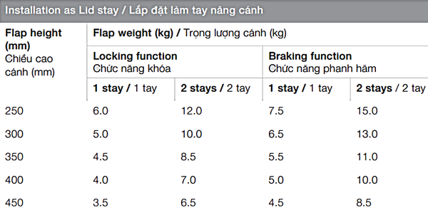 | Trọn bộ gồm: 1 tay nâng, 1 bas gắn tủ và 1 bas bắt vít cho cánh | |